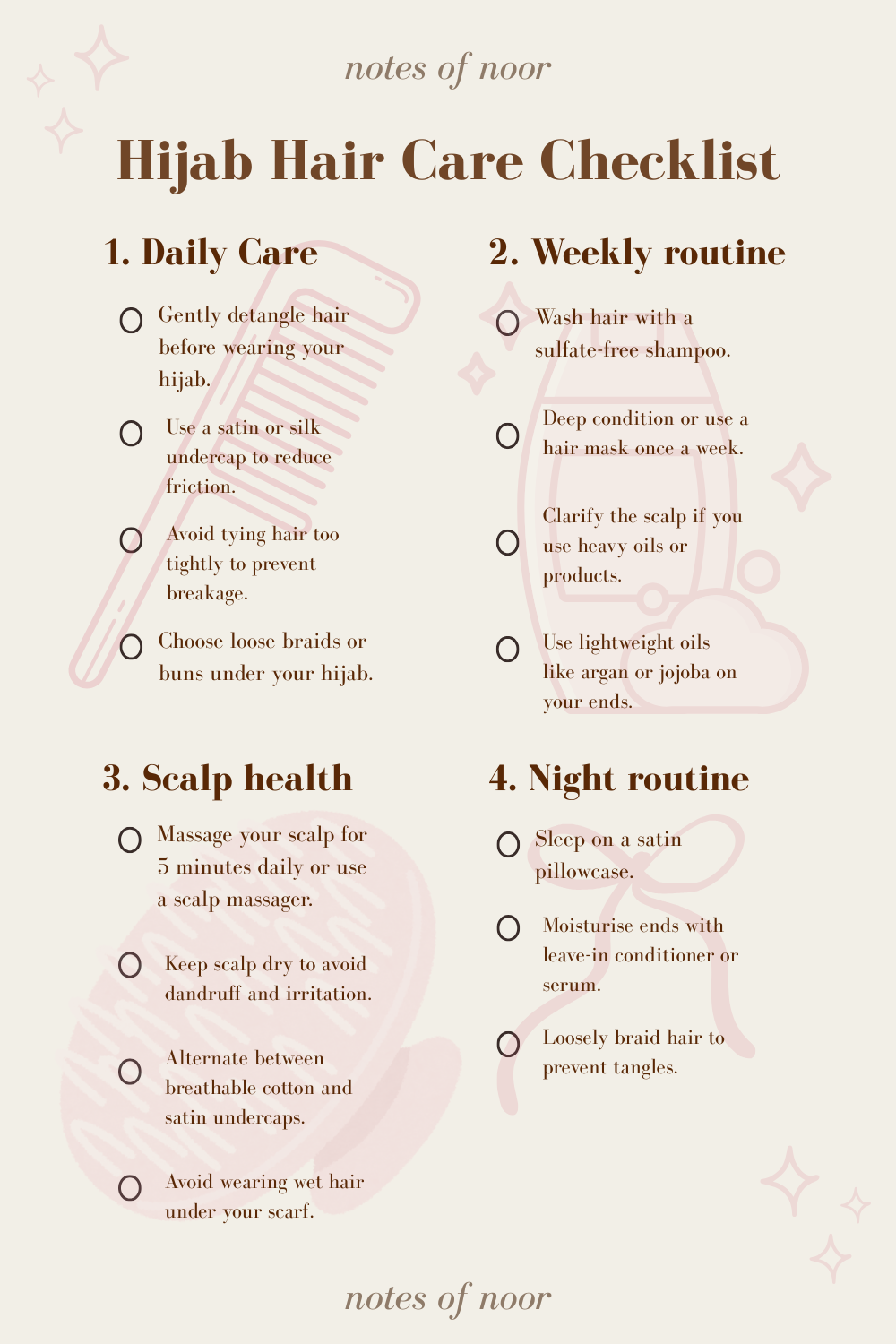 Here at Notes of Noor, we're a team of hijabis who fully understand and appreciate the difficulties of having and maintaining hair while wearing hijab. Below is a gentle, practical guide to maintaining healthy hijabi hair — including scalp care, moisture routines, and product recommendations. Read to the end to download our free checklist on maintaining healthy hair!